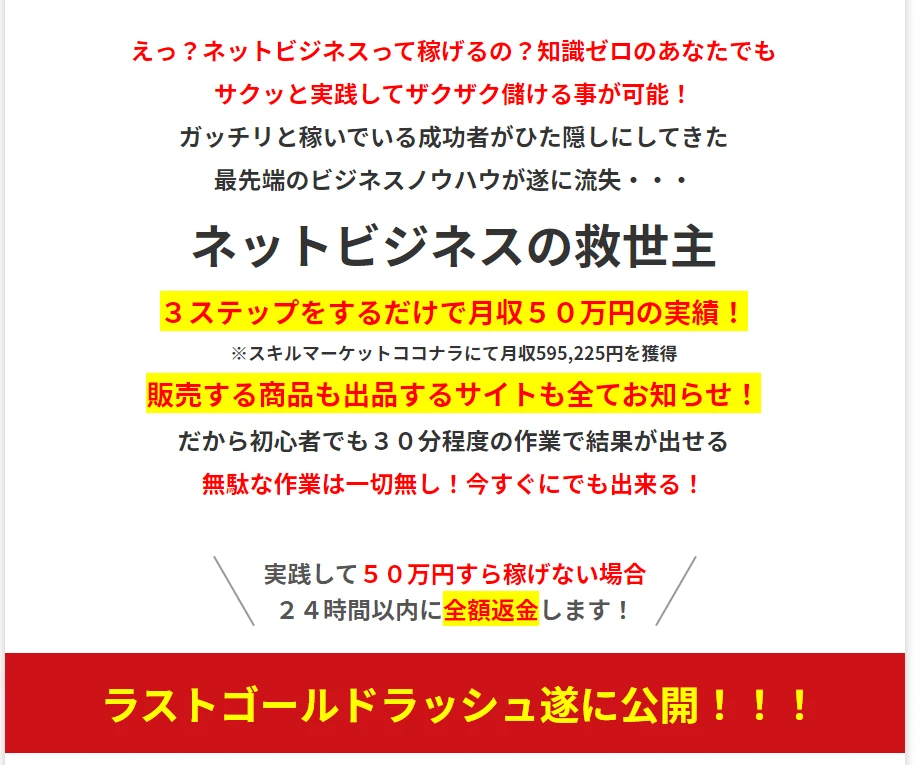 推測ですが、この『ラストゴールドラッシュ~ネットビジネス救世主~』自体が販売(アフィリエイト)する商材なのかもしれません。